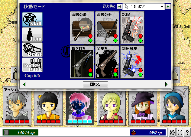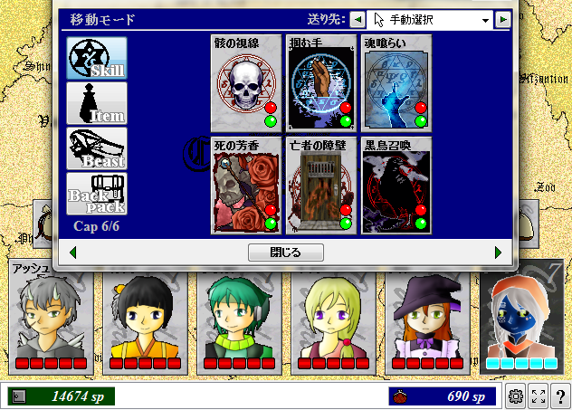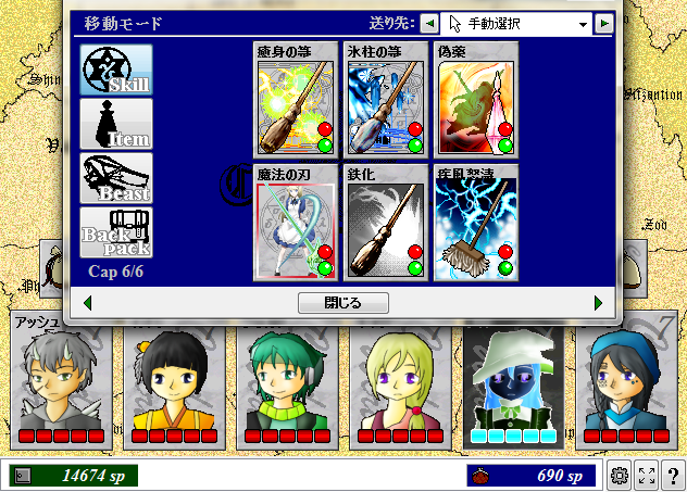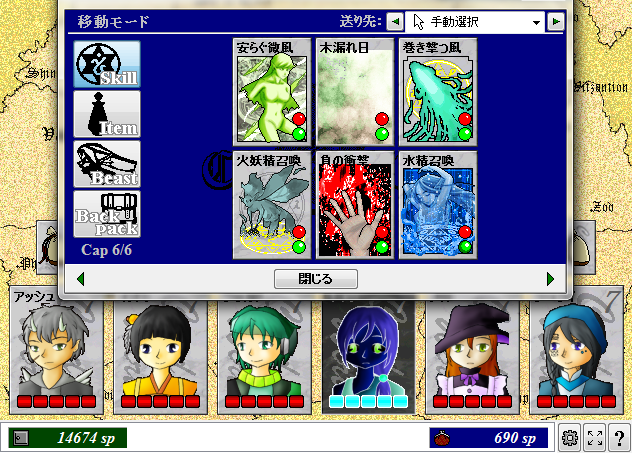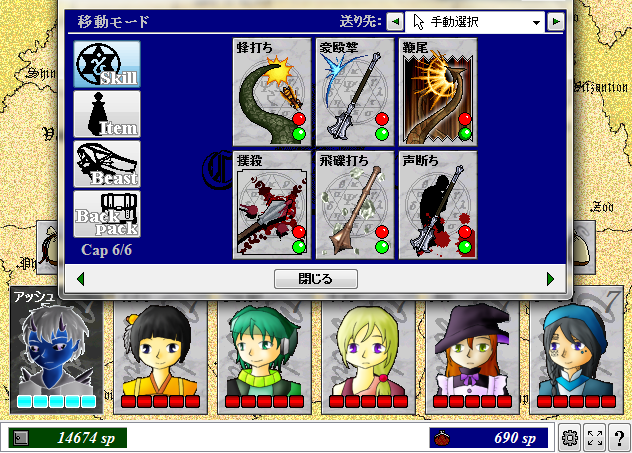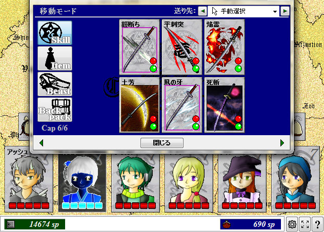 鎧断ち、風の牙、魔法の刃(隠れ里 ビスティア) 平刺突、焔霊(古城の老兵) 土芳(ネクロポリス)